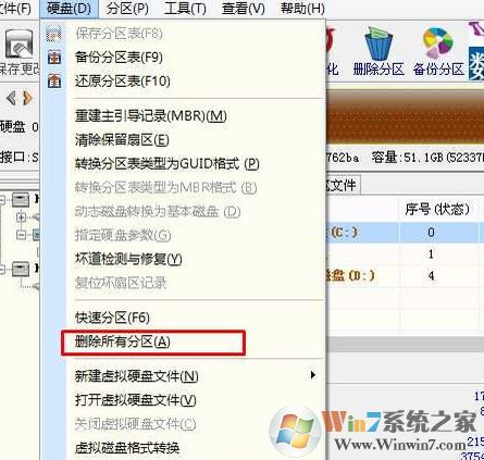 1、打開上圖的Diskgenius分區(qū)工具;打開Diskgenius后,選擇筆記本硬盤,然后點擊“硬盤”——“刪除所有分區(qū)“,刪除前確保資料已經(jīng)轉(zhuǎn)移,刪除后,點擊保存更改;