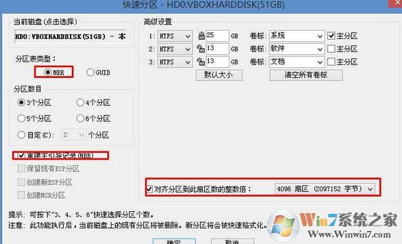 3、轉(zhuǎn)換完成后,執(zhí)行快速分區(qū),分區(qū)大小幾磁盤個數(shù)自己選擇,確保分區(qū)表類型為MbR ,及勾選了重建主引導(dǎo)記錄MBR,按下確定后開始分區(qū)(對了,如果是固態(tài)硬盤可要4K對齊一下哦);