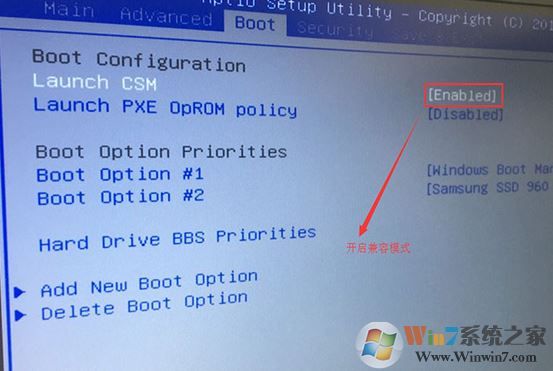2、重啟后切換到BOOT的選項(xiàng),把Launch CSM由disabled改成enabled,開啟兼容模式;