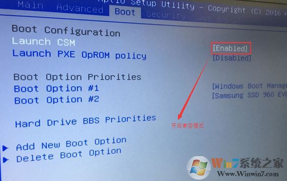 2、重啟后切換到BOOT的選項(xiàng),把Launch CSM由disabled改成enabled,開啟兼容模式;