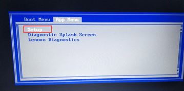 1、重啟筆記本按F12,按TAB鍵切換欄目到"App Menu",然后選擇"setup"進入BIOS設置,或是看到lenovo或ThinkPad標識后多次按Enter回車,聽到報警聲后等待下一畫面,然后按F1或Fn+ F1進入BIOS主界面。如下圖所示;