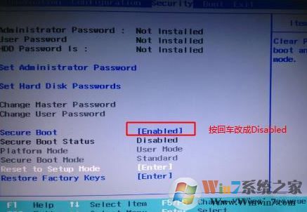 1、開(kāi)機(jī)一直按F2或(FN+F2)進(jìn)入BIOS,按→方向鍵切換到Security,選擇Secure Boot回車設(shè)置成Disabled;