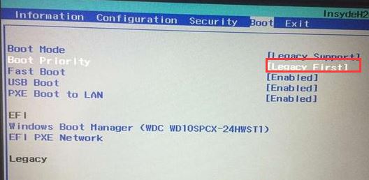 5、再把Boot Priority設(shè)置成Legacy First,按F10彈出窗口選擇yes回車;