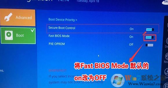 4、將Fast BIOS Mode后面的開關(guān)關(guān)掉(On變成Off),如下圖所示;