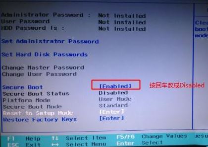 1、重啟計(jì)算機(jī),開機(jī)的時(shí)候一直按F2或(FN+F2)進(jìn)入BIOS,按→方向鍵切換到Security,選擇Secure Boot回車設(shè)置成Disabled;