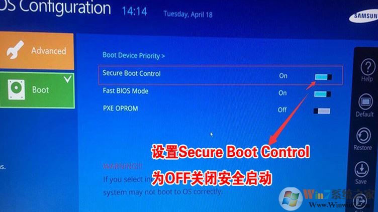 2、切換到BOOT的選項(xiàng),將Secure Boot Control后面的開(kāi)關(guān)關(guān)掉(On變成Off),關(guān)閉安全啟動(dòng),該步是改WIN7的重要一步,如下圖所示;