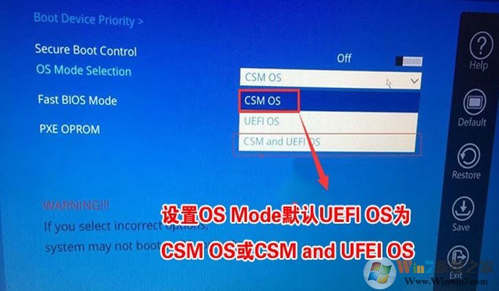 3、關(guān)閉安全啟動(dòng)后,BOOT選項(xiàng)中就會(huì)多出一個(gè)OS Mdoe Selection選項(xiàng),我們將默認(rèn)的UEFI OS改為CSM OS或CSM and UEFI OS,如下圖所示;