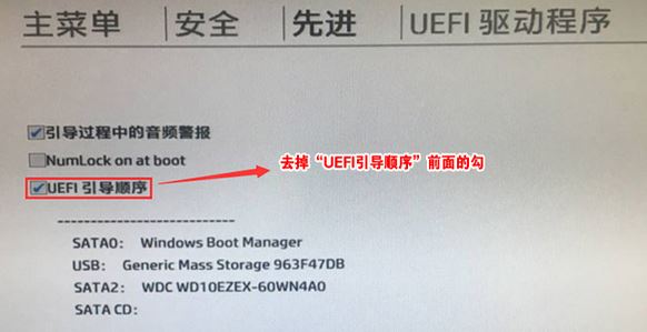 6、進(jìn)入后將UEFI順序前面的勾去掉,讓機(jī)器默認(rèn)為傳統(tǒng)啟動(dòng),這樣方便安裝WIN7,如下圖所示;