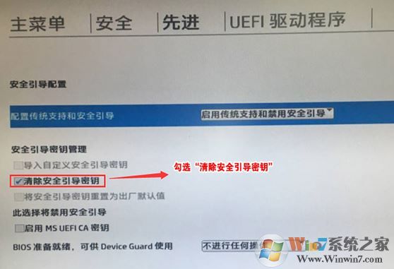 4、F10保存重啟后再次開(kāi)機(jī)按ESC,然后選擇F10進(jìn)入BIOS設(shè)置,將進(jìn)入剛設(shè)置的地方,勾選“清除安全引導(dǎo)密鑰”,然后再次F10保存;