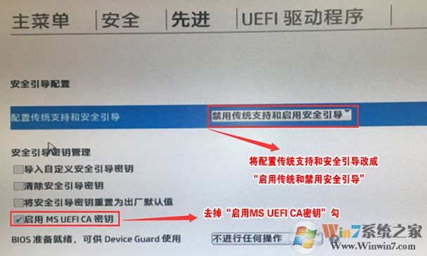 3、回車后,將配置傳統(tǒng)支持和安全引導(dǎo)設(shè)置電腦“啟用傳統(tǒng)支持和禁用安全引導(dǎo)”以及去掉“啟用MS UEFI CA密鑰”前面的勾,然后按F10保存更改;