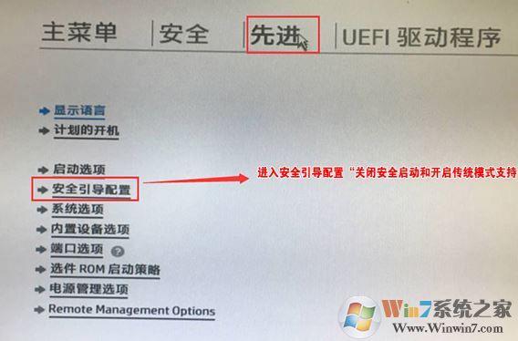 2、進(jìn)入BIOS后,將移動(dòng)鍵盤到“先進(jìn)”選項(xiàng)下,選擇"安全引導(dǎo)配置",按回車鍵進(jìn)入設(shè)置;