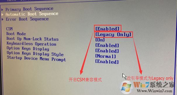 3、切換到Boot,把Boot Mode從UEFI改成Legacy only引導(dǎo)模式,再把csm默認(rèn)disabled改成enabled,開啟兼容模式,選擇F10保存設(shè)置,在彈出的選項(xiàng)中選擇YES;