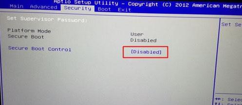 1、重啟筆記本按F2進(jìn)入BIOS設(shè)置,在Security下把Secure Boot Control設(shè)置為Disabled,如下圖所示;