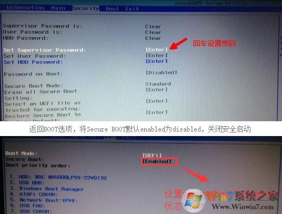 2、如果Secure Boot灰色無(wú)法設(shè)置,則轉(zhuǎn)到Security,選擇Set Supervisor Password回車(chē)設(shè)置密碼,再返回BOOT選項(xiàng),將Secure BOOT默認(rèn)enabled為disabled,(注:改完secure boot后再設(shè)置密碼為空即可,要不每次進(jìn)BIOS都要設(shè)置)如下圖所示;