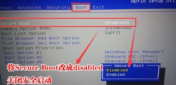 2、再切換到BOOT頁面,選擇secure Boot按回車改成Disabled,如圖所示;