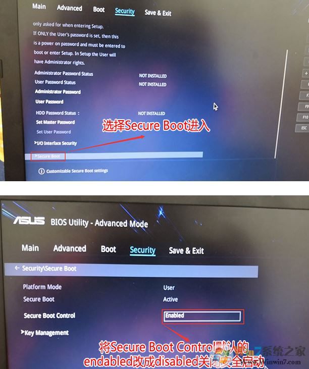 2、進(jìn)入高級模式后,按→方向鍵移動到Security,選擇Secure Boot,然后回車進(jìn)入把Secure Boot control選enabled改為disabled關(guān)閉安全啟動;