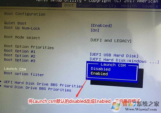 3、再將launch csm設(shè)置為Enabled,開啟兼容模式,如下圖所示,然后再F4保存設(shè)置;