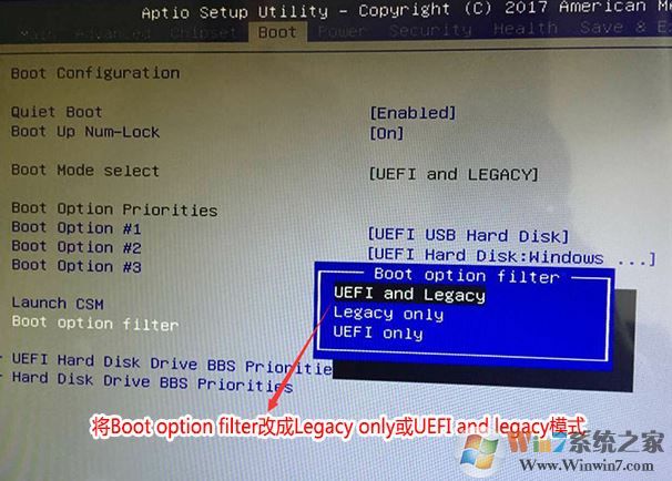 2、重啟后再按delete,進(jìn)入選擇Boot選項,將Boot option filer回車設(shè)置成legacy only或uefi and legacy,如下圖所示;