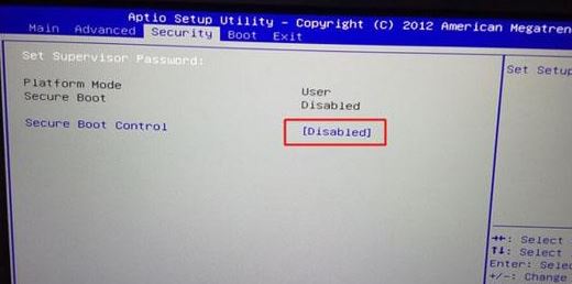 1、重啟筆記本按F2進(jìn)入BIOS設(shè)置,在Security下把Secure Boot Control設(shè)置為Disabled,如下圖所示;