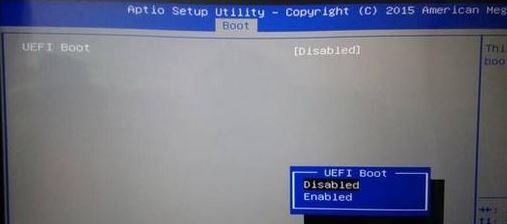 3、選擇UEFI Boot回車(chē)設(shè)置成Disabled,如果有CSM,設(shè)置為Enabled,然后按F10保存設(shè)置;