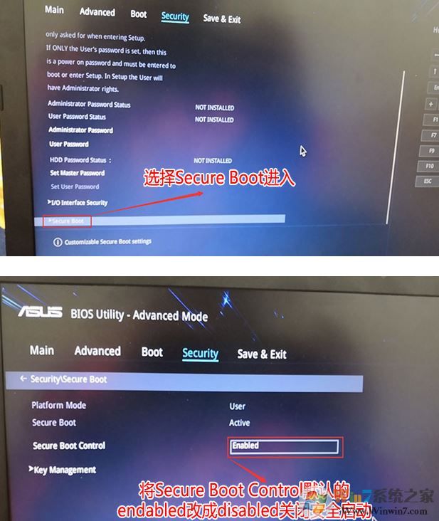 2、進(jìn)入高級(jí)模式后,按→方向鍵移動(dòng)到Security,選擇Secure Boot,然后回車進(jìn)入把Secure Boot control選enabled改為disabled關(guān)閉安全啟動(dòng),如圖:
