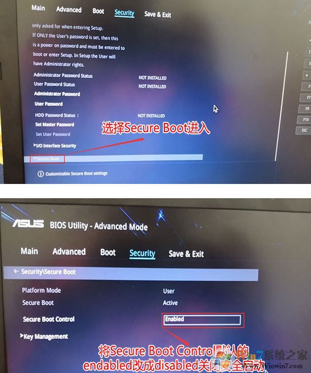 2、進入高級模式后,按→方向鍵移動到Security,選擇Secure Boot,然后回車進入把Secure Boot control選enabled改為disabled關閉安全啟動;