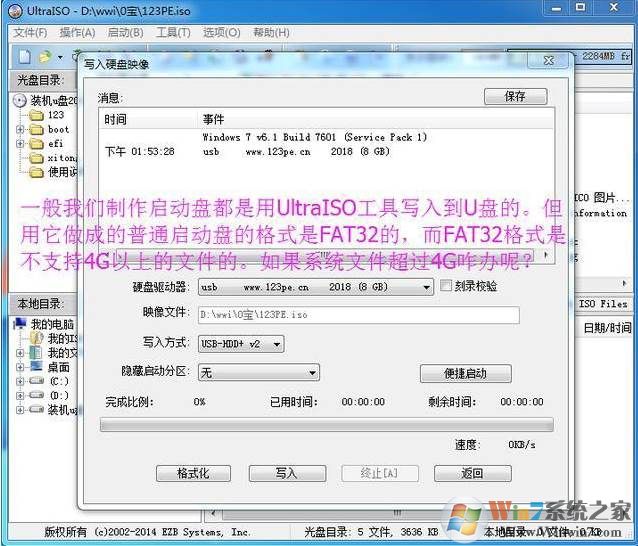 通常情況下,我們下載到系統(tǒng)ISO鏡像都可以直接使用UltraISO(軟碟通)直接寫入到U盤,這樣一個(gè)系統(tǒng)安裝盤就制作好了。用U盤啟動(dòng)就可以安裝系統(tǒng),但是呢,有一個(gè)問題,用它制作的啟動(dòng)盤都是Fat32格式的,如果系統(tǒng)ISO鏡像里有文件大于4G的話是不能寫入到FAT32U盤下的,如果轉(zhuǎn)為NTFS又會(huì)不支持啟動(dòng),這要如何解決呢?