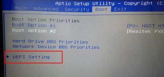 2、轉(zhuǎn)到Boot界面,選擇UEFI Setting回車;