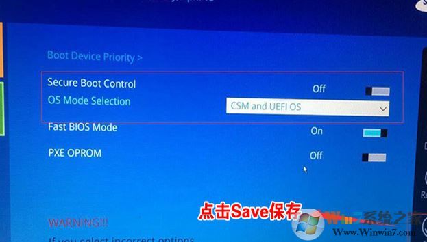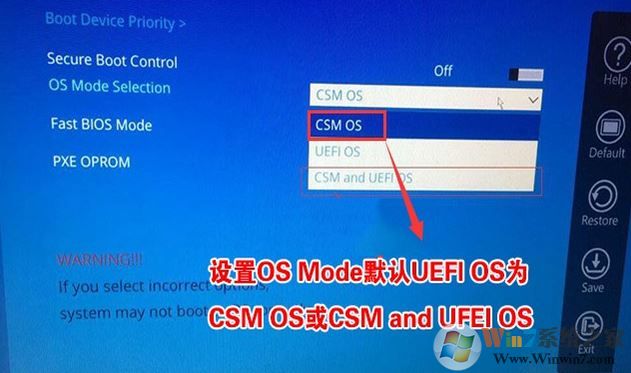 3、關(guān)閉安全啟動后,BOOT選項中就會多出一個OS Mdoe Selection選項,我們將默認的UEFI OS改為CSM OS或CSM and UEFI OS,如下圖所示;
