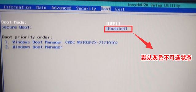 1、開機(jī)一直按F2進(jìn)入BIOS,按F2進(jìn)入BIOS界面,首先我們要關(guān)閉安全啟動(secure boot選項默認(rèn)為enabled),切換BOOT項后發(fā)現(xiàn)secure boot灰色不可選狀態(tài),如下圖所示;