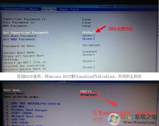 2、如果Secure Boot灰色無法設(shè)置,則轉(zhuǎn)到Security,選擇Set Supervisor Password回車設(shè)置密碼,再返回BOOT選項,將Secure BOOT默認(rèn)enabled為disabled,(注:改完secure boot后再設(shè)置密碼為空即可,要不每次進(jìn)BIOS都要設(shè)置)如下圖所示;