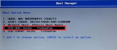 5、插入U盤啟動盤,重啟時不停的按下f12,打開Boot Manager,選擇USB HDD回車從U盤啟動,如下圖所示;