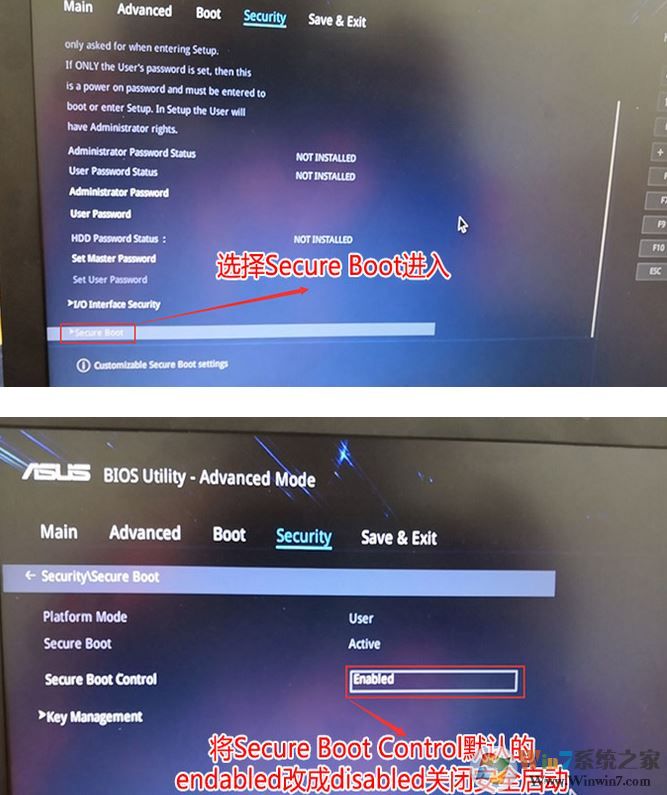 2、進入高級模式后,按→方向鍵移動到Security,選擇Secure Boot,然后回車進入把Secure Boot control選enabled改為disabled關(guān)閉安全啟動,然后按F10保存重啟;