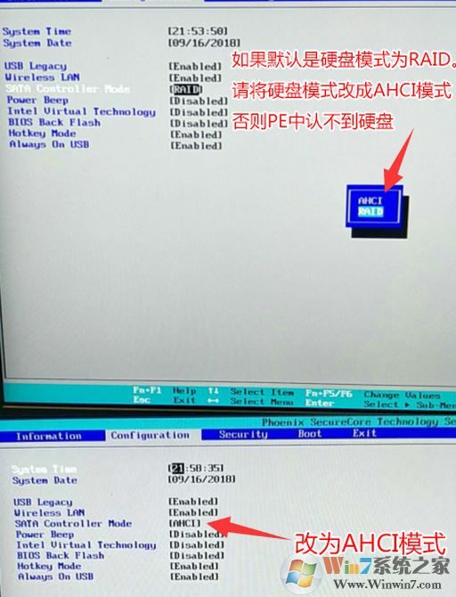 6、注意:如果默認(rèn)硬盤模式為RAID,請(qǐng)將硬盤模式改為AHCI模式,否則進(jìn)PE后不能認(rèn)出硬盤,如下圖所示;