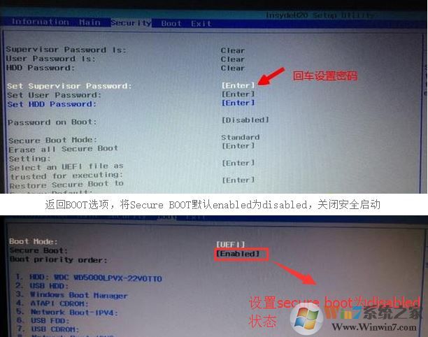 2、如果Secure Boot灰色無法設(shè)置,則轉(zhuǎn)到Security,選擇Set Supervisor Password回車設(shè)置密碼,再返回BOOT選項,將Secure BOOT默認enabled為disabled,(注:改完secure boot后再設(shè)置密碼為空即可,要不每次進BIOS都要設(shè)置)如下圖所示;