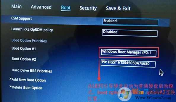 3、繼續(xù)把boot option#1選項(xiàng)改為普通引導(dǎo)的,boot option#1和boot option#2硬盤(pán)啟動(dòng)位置對(duì)換,設(shè)置第一啟動(dòng)項(xiàng)為普通硬盤(pán)引導(dǎo),帶Windwos Boot Manager的為UEFI引導(dǎo)分區(qū);