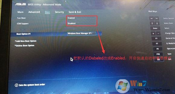 2、重啟后切換到BOOT的選項(xiàng),分別把fast boot和csm support由disabled改成enabled,分別開啟快速啟動和兼容模式;