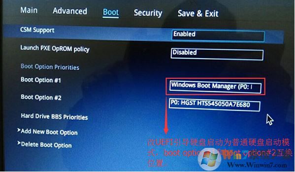 3、繼續(xù)把boot option#1選項(xiàng)改為普通引導(dǎo)的,boot option#1和boot option#2硬盤啟動位置對換,設(shè)置第一啟動項(xiàng)為普通硬盤引導(dǎo),帶Windwos Boot Manager的為UEFI引導(dǎo)分區(qū);