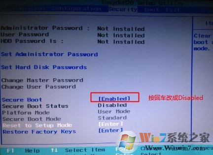1、開機(jī)一直按F2或(FN+F2)進(jìn)入BIOS,按→方向鍵切換到Security,選擇Secure Boot回車設(shè)置成Disabled,關(guān)閉安全啟動(dòng),否則安裝win7會(huì)失敗,如下圖所示;
