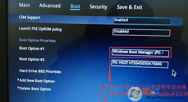 3、繼續(xù)把boot option#1選項(xiàng)改為普通引導(dǎo)的,boot option#1和boot option#2硬盤(pán)啟動(dòng)位置對(duì)換,設(shè)置第一啟動(dòng)項(xiàng)為普通硬盤(pán)引導(dǎo),帶Windwos Boot Manager的為UEFI引導(dǎo)分區(qū);