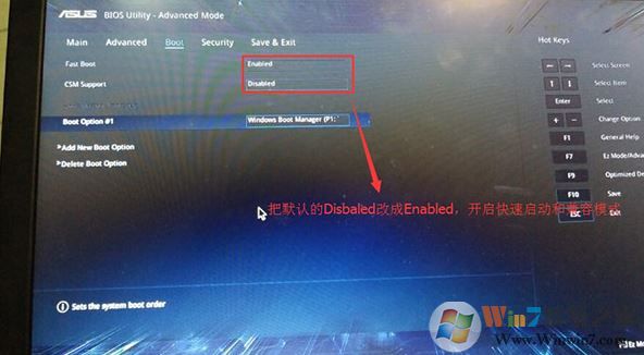 2、重啟后切換到BOOT的選項(xiàng),分別把fast boot和csm support由disabled改成enabled,分別開(kāi)啟快速啟動(dòng)和兼容模式;