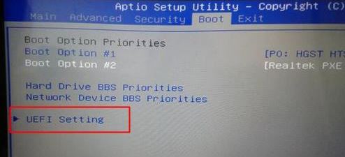 2、轉(zhuǎn)到Boot界面,選擇UEFI Setting回車;
