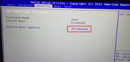 1、重啟筆記本按F2進(jìn)入BIOS設(shè)置,在Security下把Secure Boot Control設(shè)置為Disabled,如下圖所示;