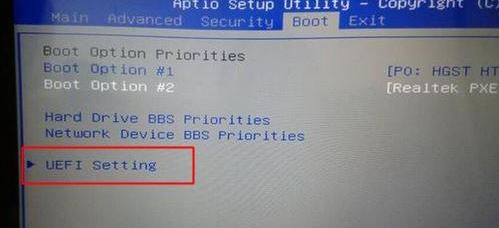2、轉(zhuǎn)到Boot界面,選擇UEFI Setting回車;