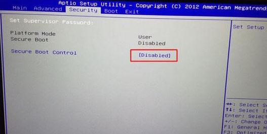 1、重啟筆記本按F2進(jìn)入BIOS設(shè)置,在Security下把Secure Boot Control設(shè)置為Disabled,如下圖所示;