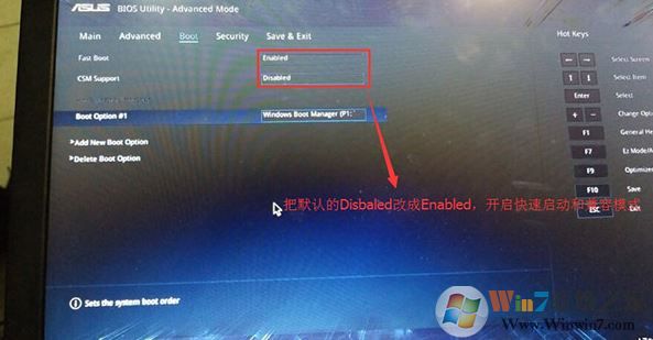 2、重啟后切換到BOOT的選項(xiàng),分別把fast boot和csm support由disabled改成enabled,分別開(kāi)啟快速啟動(dòng)和兼容模式;