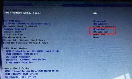 3、進(jìn)入后把Secure Boot設(shè)置成Disabled,再把Legacy Support設(shè)置成Enabled,按F10選擇Yes回車保存;
