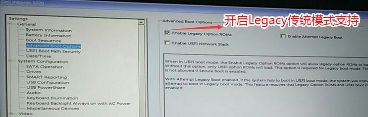 3、切換到Advanced Boot Options將右邊的Enable legacy option roms選項(xiàng)打勾,如下圖所示;