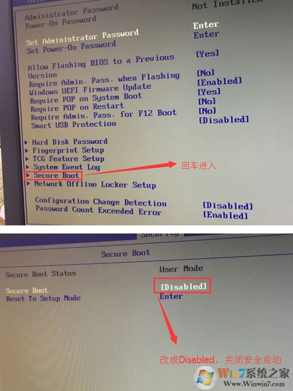 1、開機一直按F2或(FN+F2)進入BIOS,按→方向鍵切換到Security,選擇Secure Boot回車設置成Disabled;