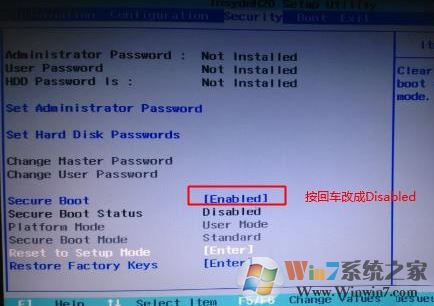 1、開機一直按F2或(FN+F2)進入BIOS,按→方向鍵切換到Security,選擇Secure Boot回車設(shè)置成Disabled,如下圖所示;